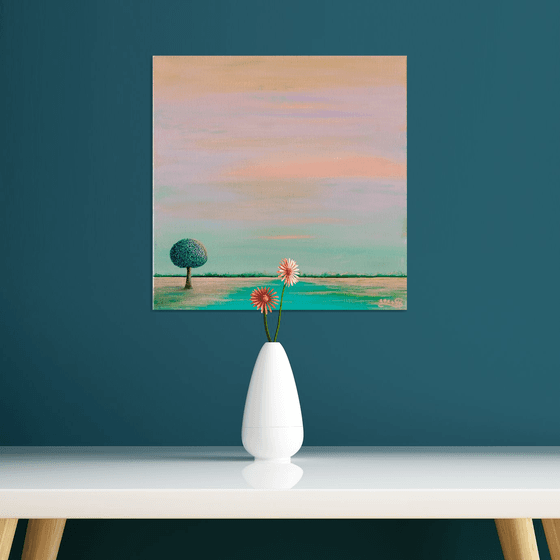 It is the 17th painting in the surrealistic series of Lone tree paintings. All paintings in this series are painted so that the sky is taking more than two thirds of the painting and the tree is just standing in the corner all alone. In this painting I created the contrast of stillness between the land and the sky. With this series of paintings I wanted it to keep it simple, so I moved away from my typical frothing technique.