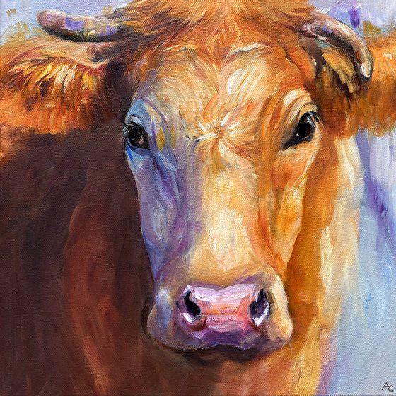 Bathed in the golden light of a setting sun, this brown cow stands in quiet contemplation. Her gaze is calm and knowing, as if she carries the wisdom of the fields. The expressive brushwork and the bold contrast of warm earth tones and cool shadows creates a striking yet harmonious portrait. A tribute to the quiet beauty of rural life.