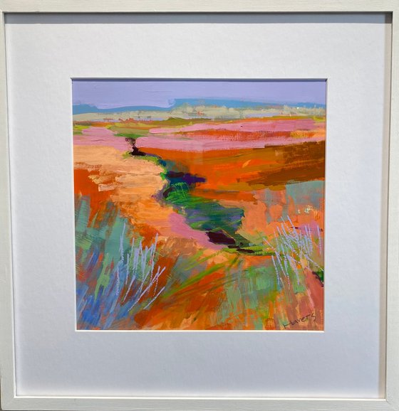 A bright palette of rich oranges and pinks contrasts with the deep greens in the ditch. A lavender mauve colour in the sky retains a sense of warmth while also toning in with the foreground grasses.