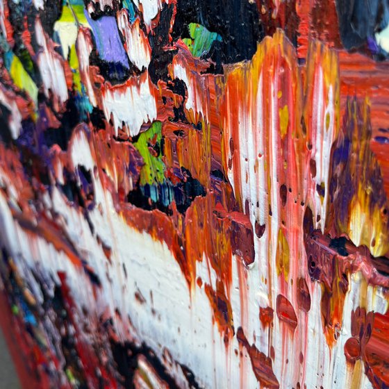This abstract expressionist painting evokes images of a city engulfed in the flames of time. The upper part of the canvas is a blurred, smoke-like memory of the past: fragments of color, reminiscent of mosaic fragments, covered in a dark haze. The middle is a chaos of emotions, where bright spots of blue, green and purple strive to break through the thick blackness. The lower part burns red - a symbol of destruction, passion and irreversibility. It seems that this is where the fracture occurred, a catastrophe in which everything flared up - perhaps the last act of tragedy or purification. The textured strokes create an effect of depth, as if pieces of reality were torn from the canvas, leaving only emotion. This is not just an abstraction - it is a confession, an exclamation of memory that still breathes in the charred fragments.