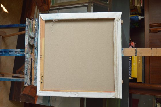 Centered within a square 60 cm canvas, the Evo II is depicted in three-quarter profile, showcasing its aggressive flared fenders, pronounced chin splitter, and towering rear wing. The oil medium lends a soft depth—gentle reflections along the hood and precise brushwork capture the car’s metal contours with cinematic lighting.