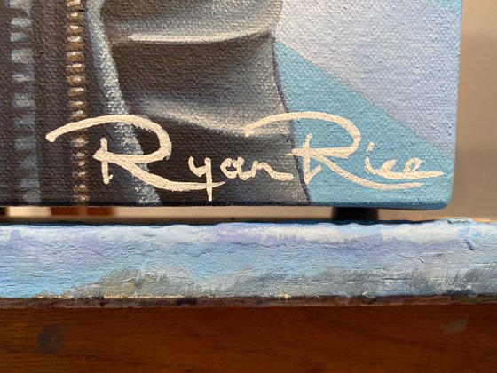 In order to distinguish one 'Millennial Falcon' from another the artist is using a list he found online of the Top Millennial names. This is his second painting in the series, his name is 'Christopher' which is the #2 most popular Millennial name. The idea for his "Millennial Falcon Series" came about, oddly enough, while he was driving. He was passing by a scrap metal shop along the side of the highway where he noticed a large metal Millennium Falcon (from the Star Wars series). When the name went through his head he said it "millennial" instead of "millennium". It was a quick trip to combine "millennial" and "falcon", using the head of a falcon on different fashions that make up the millennial trends. In order to distinguish one 'Millennium Falcon' from another the artist is using a list he found online of the Top Millennial names.