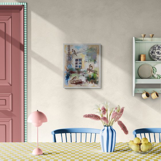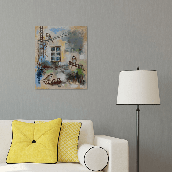 In this oil painting, I attempted to create a harmonious dialog between nature and human presence by capturing the ephemeral morning light illuminating the serene interaction of birds at an old window. Mixing impressionism and symbolism, I aimed to evoke a sense of peace and contemplative stillness, inviting viewers to pause and reflect on the simplicity and beauty of fleeting moments in daily life. The subtle, earthy tones and textured strokes enhance the overall symbolic and tranquil atmosphere, making it an ideal piece to infuse any space with a calm, reflective energy.
