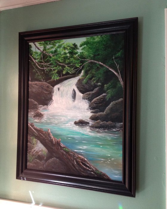 Under the coolness of the trees, water flows down the mountain and leaps to the rocks below before gathering in a pool of serene blue stillness. This painting is based on a cascade I discovered on a trip to the Great Smoky Mountains National Park and seeks to capture the nature of the journey of water in these ancient mountains.