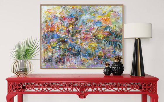 The work was inspired by Mystery Train, an Irish radio show with John Kelly. The music immediately transports me to a different world, where I travel in my imagination. You will have to stretch the canvas.