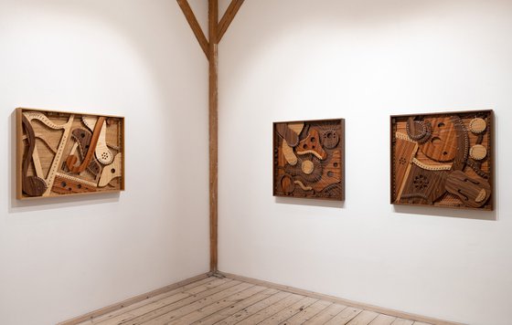 In these complex wall sculptures, various wood pieces coexist with numerous overlapping strings, creating ‘abstract’ 3D paintings/reliefs that refer to musical instruments and musical symbols. I have created musical instruments and sound sculptures in the past, which are kinetic or interactive. However, this time I try to represent sound and musicality only visually, in works that are static, not interactive, and silent, but can still reveal all the dynamics and tensions present in music. Different types of strings have been used (steel, brass, etc.) which refer to various musical instruments, but now acting as visual ‘line’ elements, that Koutsouris uses to ‘paint’ on his 'wooden canvas’.