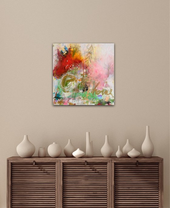 acrylics, neon paint, gold, spray paint, pastels, on high quality canvas