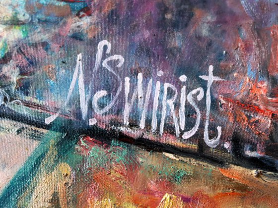 I deliberately stretched and distorted her figure, because I wasn’t interested in a literal portrait. What I wanted to capture was her essence — her inner world rather than her outward appearance. The vivid brushstrokes, the fiery whirl of her hair, the patterns on her dress, and the colorful bag all reflect the intensity of her emotions.