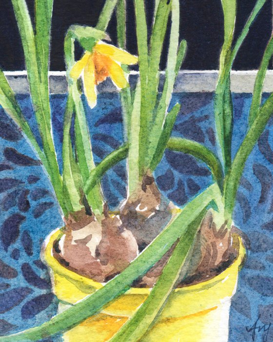 I couldn't resist buying this pot of narcissus as I was walking past the florist. The yellow pot added a playful element to the already cheerful flowers. This still life composition was painted from life. I decided to keep the background dark to help highlight the flowers.