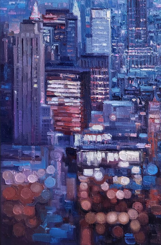 An oil painting capturing New York at twilight, where the cool tones of the city meet the warm glow of evening lights. Painted with bold, expressive brushstrokes, the scene balances clarity and softness, giving a sense of depth and movement. The city unfolds like a quiet cinematic frame, suspended between day and night.