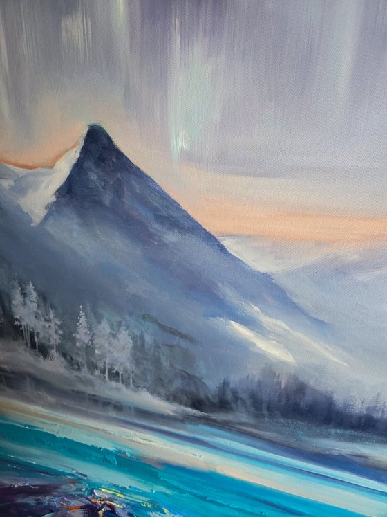 This painting captures the quiet brilliance of the northern sky — where the aurora stretches like soft columns of light above snow-covered peaks. A solitary mountain rises with calm strength, while the forest below rests in winter stillness. Across the frozen lake, bold strokes of color reflect the energy above — not just a mirror, but a response. Cool blues meet flashes of magenta and orange, giving the piece a rhythm that feels both natural and abstract. It’s a celebration of light, air, and space — a moment wide open.