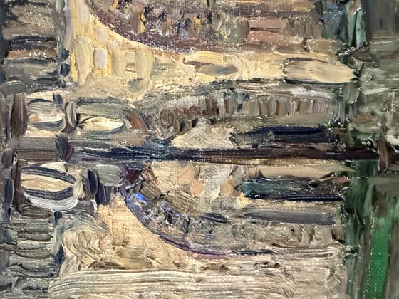 This captivating artwork portrays the iconic façade of Notre-Dame Cathedral in Paris, bathed in muted yet dynamic brushstrokes that evoke a sense of timelessness. The artist skillfully captures the grandeur of the gothic architecture, accentuating the cathedral's twin towers and intricate stonework. The sky is rendered with soft, swirling hues of gray and blue, suggesting a serene, overcast day. In the foreground, subtle hints of movement are depicted with figures and trees, adding life to the scene without detracting from the majestic centerpiece. The use of impasto technique adds texture and depth to the paint, highlighting the structural details and enhancing the overall impressionistic style. This work is a masterful blend of architectural precision and expressive atmosphere, encapsulating the essence of Parisian heritage and the enduring allure of Notre-Dame.