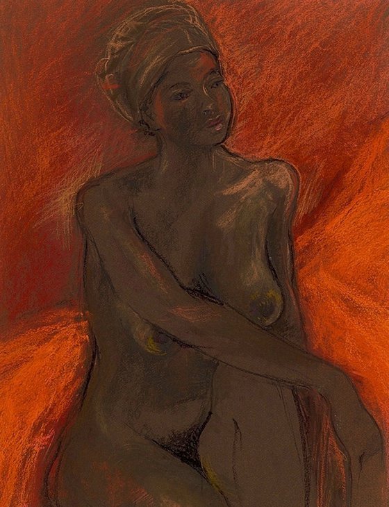 This girl had the most beautiful face and composure while she was modelling. The orange background off set her chocolate coloured skin. She was reclined on a cloth which enhances her skin. She was painted from life at a life class