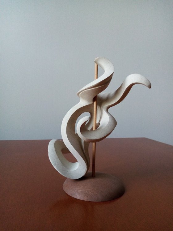 This piece is made of a sandstone called 'pietra leccese', it is rough with grey pigments. The artwork can be positioned in two opposite positions on the wooden base with the stick at the center.