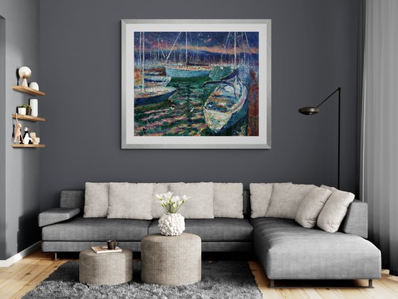 “On the edge of calm” is an original impressionist painting created in the marina of Hendaye, on the Bay of Biscay in France. Evening light shimmers across the water as sailboats rest in stillness. Expressive palette knife strokes evoke the serenity of the sea and the texture of coastal air. A poetic and peaceful addition to any space, filled with the essence of the Atlantic coast.