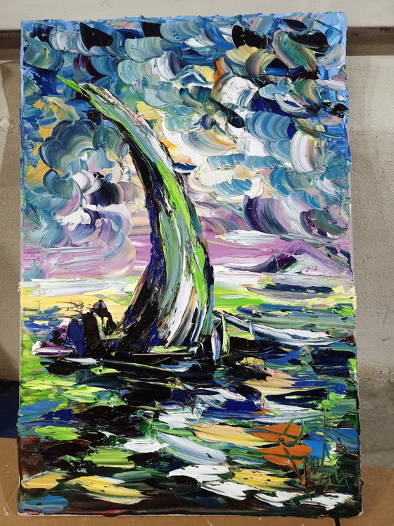 Antonino Puliafico’s "Rebellious Wave" is a striking representation of nature’s untamed power and elegance. Through bold and dynamic strokes, the artist captures a single wave frozen in a moment of defiance, rising against the force of the surrounding waters. The vibrant palette of greens, blues, and purples conveys the wave’s energy and movement, while the textured surface, achieved through the palette knife, brings a tangible depth to the composition.