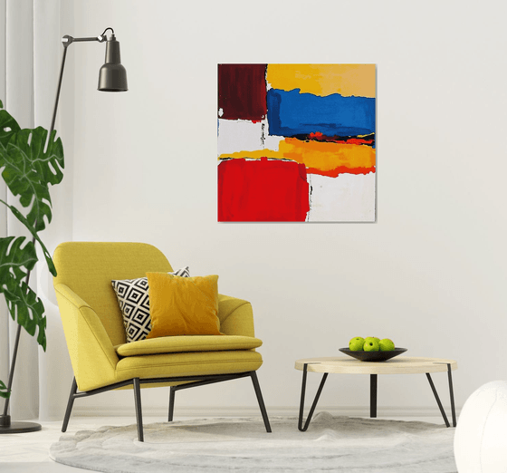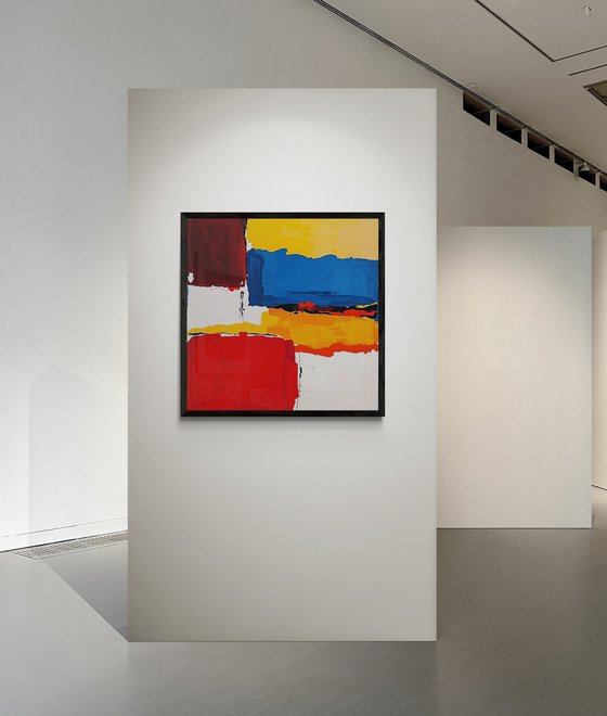 The work does not represent anything figurative, but creates a tangible visual space through the tension and harmony between the blocks of color. Orange seems to push forward, while blue offers a stable counterpoint, and the other colors act as intermediaries or accents that enrich the composition. It is an emotional landscape, a conflict or an embrace between chromatic forces.