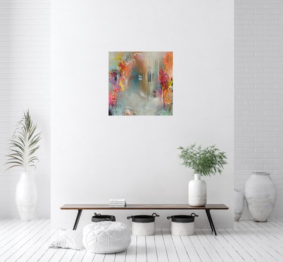 Over the Moon No.1 is a 60 cm/23.62 in H x 60cm/23.62 in W in, 4 cm/1.5 in deep mixed media painting.
