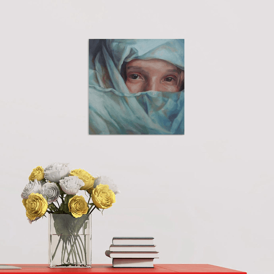 "Pale blue shelter" is an intimate oil painting that captures a pair of eyes peering through folds of pale blue cloth. The fabric creates a quiet cocoon around the subject, offering both concealment and protection. As an portrait artist I love to explore subject of human face. Oil painting on canvas board. ...