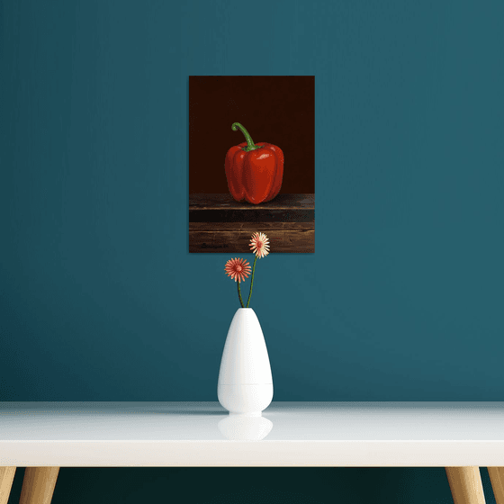 "Red Bulgarian Pepper" by Gevorg Sinanyan is an exquisite 22x31 cm oil on wood panel painting that captures the natural beauty and simplicity of a single red pepper. The artist’s meticulous attention to detail and use of rich, deep hues bring out the vibrant, lifelike quality of the pepper. The dark background enhances the vivid red, making the subject pop and creating a striking visual contrast. This piece celebrates the elegance found in everyday objects, making it a perfect addition to any kitchen or dining area, and a charming piece for still life art enthusiasts.