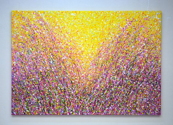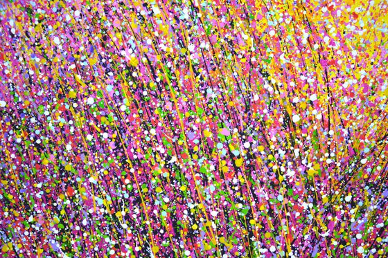 In creating this vibrant explosion of color, I tapped into the raw emotions of joy and uninhibited celebration. Using acrylics, I layered spontaneous bursts of pink, yellow, and myriad hues to capture a sense of unrestrained exuberance, akin to a field of flowers in the full bloom of spring. This painting pulses with life and energy, designed to invigorate and uplift any space it graces, bringing with it a reminder of life's boundless positivity. The work is painted with acrylic paints on canvas. Varnished. The sides are painted in the color of the picture. Artist's signature. Ready to hang. The picture is of good spatial quality, the colors evoke children's happiness. Certificate of Authenticity.