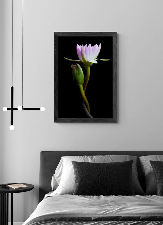 Australian native pink water lilies blossoming, naturally lit against a black setting creating stunning colour contrasts and highlighting the elegant structure of these beautiful flowers.