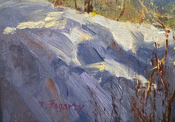The oil painting surface is protected with a coat of Gamvar varnish. It is unframed and will require a frame to hang on the wall. The image showing the artwork framed is for presentation of potential framing idea only. Frame is not included. It can easily slot into a standard 16"x20" frame.