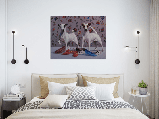 One of a kind artwork. Image of dogs playing with their owners' shoes. Signed on the back and front of the canvas, the work will be carefully packed in a protective film and thick cardboard.