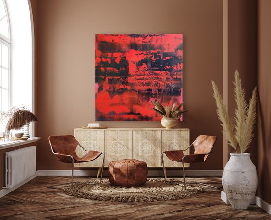 With bold and vivid colours of red and black, this abstract evokes a feeling of passion and mystery. Reflections on late sunset waters or deep primal rhythms that pulsate across the canvas.