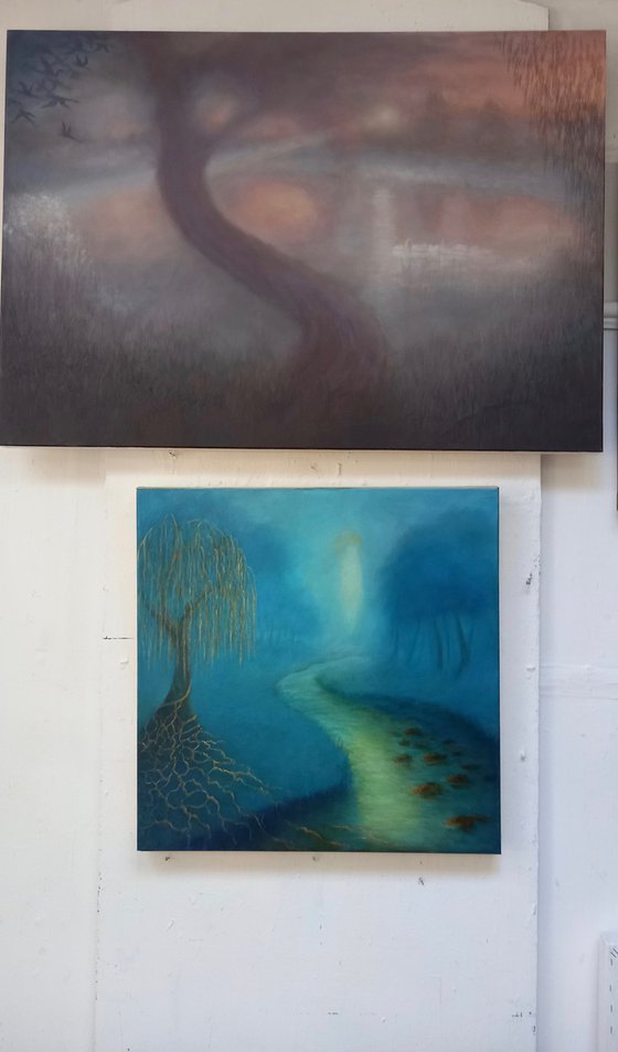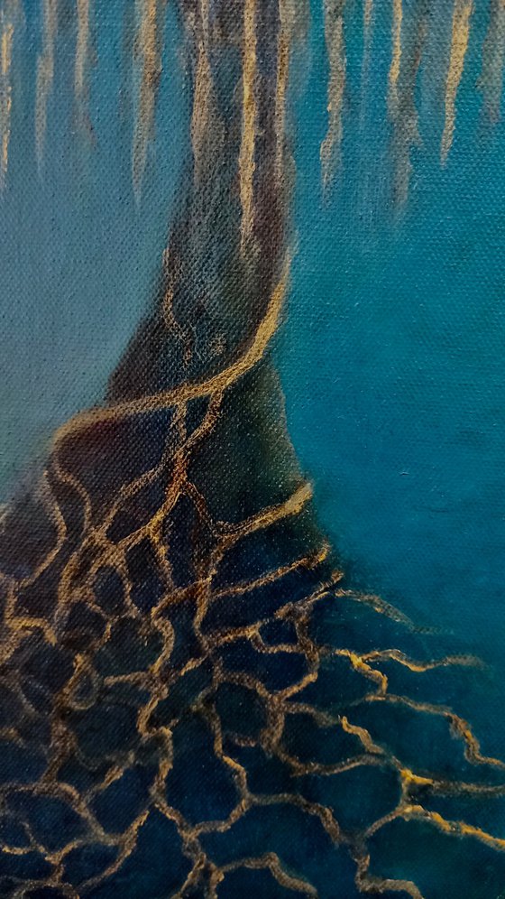 Mythical shining messenger radiating through the trees onto a river with golden willow tree with threads of gold reaching down towards the water. Metallic gold oil paint and 5cm deep metallic edges.