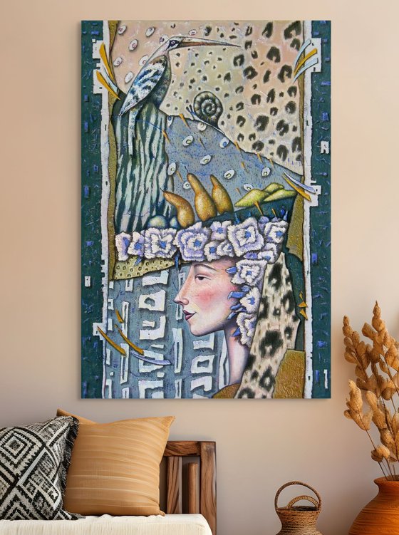 A cascade of abstract symbols flows behind a girl’s profile, her silhouette framed by pale purple flowers, becomes the delicate axis of the work - the promise of spring intertwined with the melancholy of endless change.