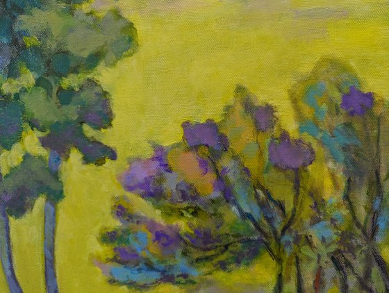 Original painting, impressionism, landscape painting, oil on canvas, semi-abstract, sky, trees in a fall.