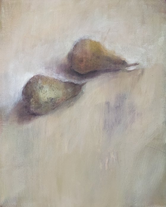 A quiet composition of three pears, where form gradually dissolves into atmosphere. One of the fruits appears to be fading — as if caught in the act of vanishing — blurring the line between presence and absence.