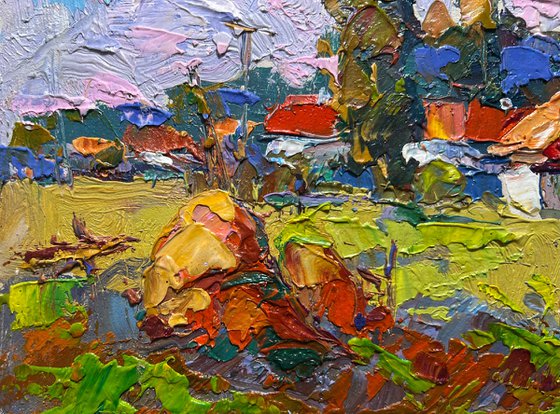 This oil painting cardboard, titled "Quiet village street", the artist employs an expressive impasto technique, using thick, dynamic brushstrokes to create a lively and immersive composition. The painting radiates warmth and serenity, inviting the viewer to experience the simplicity and beauty of a quiet countryside setting. The foreground features a field painted in shades of soft greens, yellows, and earthy browns, suggesting a late summer or early autumn landscape. Small haystacks, depicted with thick, textured strokes of ochre and orange, are scattered across the field, adding depth and a rustic charm to the composition. The uneven terrain, with patches of warm and cool tones, gives the impression of a natural, well-tended field, reinforcing the rural atmosphere. In the middle ground, a row of village houses with red-tiled roofs and whitewashed walls nestles among lush green trees. The houses, painted with loose but deliberate strokes, convey a sense of coziness and timelessness. The rooftops catch the warm light, creating a striking contrast against the cooler tones of the sky and surrounding foliage. Wooden fences and utility poles line the street, adding vertical elements that guide the viewer’s eye through the scene. The background is dominated by a brilliant sky filled with swirling clouds in shades of blue, pink, and white. The artist’s expressive brushwork gives the sky a dynamic, almost dreamlike quality, capturing the movement of clouds drifting across the horizon. The contrast between the cool sky and the warm earth tones enhances the painting’s depth and creates a sense of balance. The painting captures the essence of a rural village where time seems to move slowly, and nature and human life coexist in harmony. Through a masterful use of color, light, and texture, the artist invites the viewer to step into this peaceful world, where the golden fields, charming houses, and vast sky create a timeless and serene landscape.