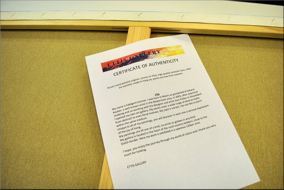 This is an original artwork by Edelgard Schroer. It's made in colorful paints on a white and light grey background, it's surface is covered with varnish to protect its beauty. The acrylic painting is signed on the front and you'll receive a certificate of authenticity with your new art.