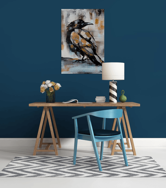 The raven’s body turns to the left, while his sharp gaze looks to the right, creating a dynamic tension — a feeling of alertness, survival, and ancient memory.