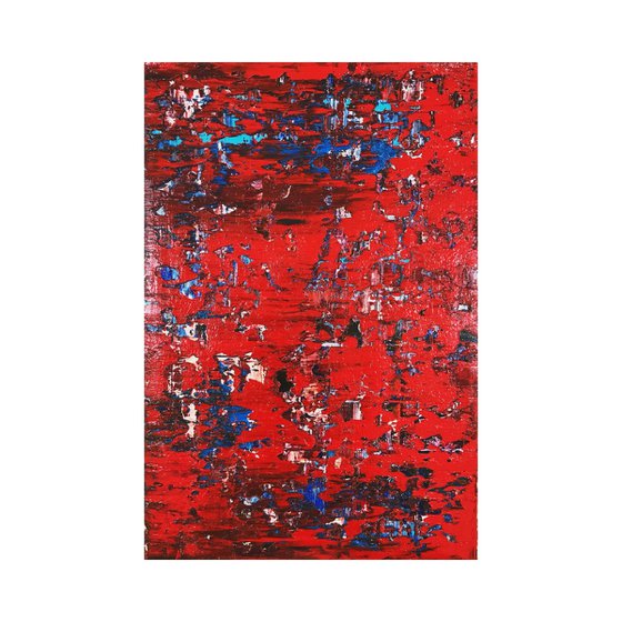 Welcome to the red zone. It's exciting. In this work, I explored the visceral intensity of red, an homage to passion and conflict. The aggressive strokes and bleeding blues amidst the crimson echo the chaos of emotions. Oils allowed me the depth and texture that bring this emotional battlefield to life, where every mark reflects a raw, unfiltered dance of thought and impulse. This piece is designed to ignite a powerful emotional response, transforming any space with its bold energy.