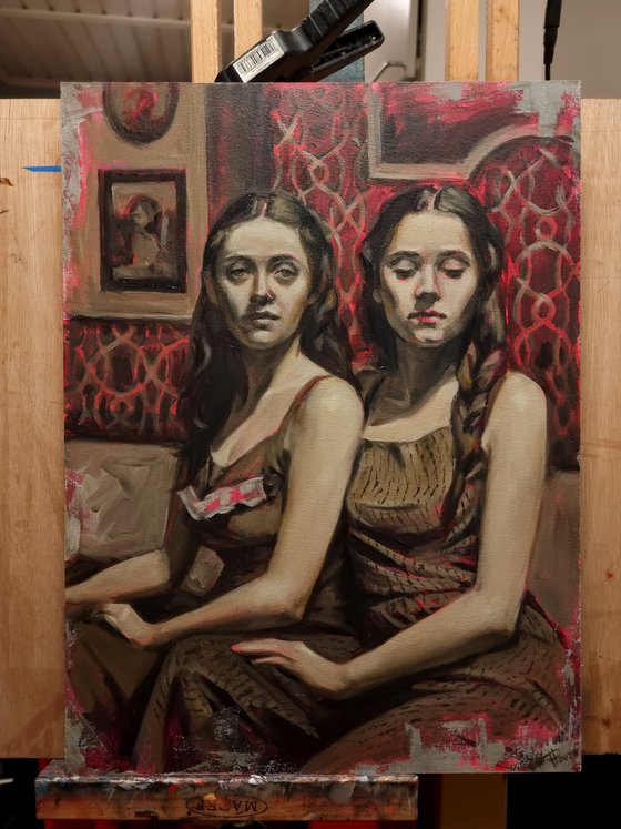 Set in a richly furnished salon of a historical Helsinki apartment, this piece captures a quiet moment between two young women on a Saturday evening, just before the party begins. The room, with its classical elegance, belongs to one of those grand old buildings in the heart of the capital—where stories, ambitions, and cultural life have long converged.