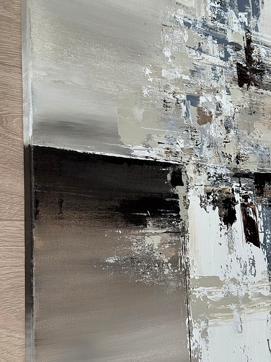 The composition is built around a palette of serene tones: warm greige, champagne beige, soft ash gray, ivory white, and deep charcoal black. Bold white strokes act as visual anchors, linking warmth and coolness, verticals and horizontals. The structural texture adds depth and layering, as if space itself has paused for a moment, inviting the viewer to "hear" the silence.
