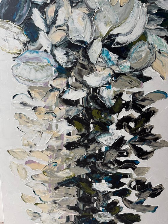 Rosée Royale is an extra-large abstract floral painting in an elegant palette of white, blue, beige, green, and soft gray — a refined visual symphony that evokes the sensation of early morning dew settling on royal gardens. Inspired by the quiet power of nature’s most delicate moments, this piece balances softness and structure through layered, expressive brushstrokes in the style of abstract impressionism.