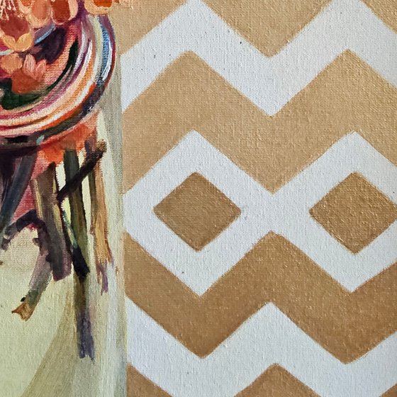 This contemporary approach to floral still life balances natural elements with graphic design sensibilities, creating a harmonious dialogue between organic forms and geometric abstraction.
