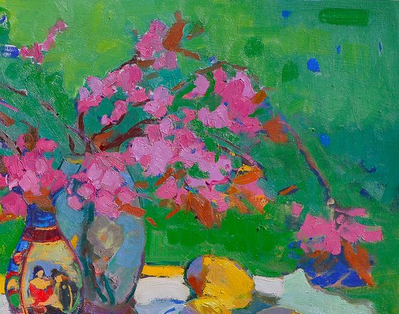 Vibrant pink blossoms in ornate vases are arranged against a lush green background, accompanied by scattered fruits on a draped white cloth. The composition exudes a lively and colorful atmosphere, highlighted by the contrasting vivid hues.