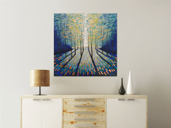 This serene piece is a lyrical interpretation of a forest, inspired by the gentle rhythms of nature. Expressive brushstrokes capture the dance of sunlight filtering through a leafy canopy, casting a warm, golden glow onto a mosaic-like forest floor of turquoise, copper, and gold. Infused with a touch of fantasy and quiet nostalgia, the painting evokes a dreamlike tranquillity—an imagined forest where time seems to pause and peace prevails.