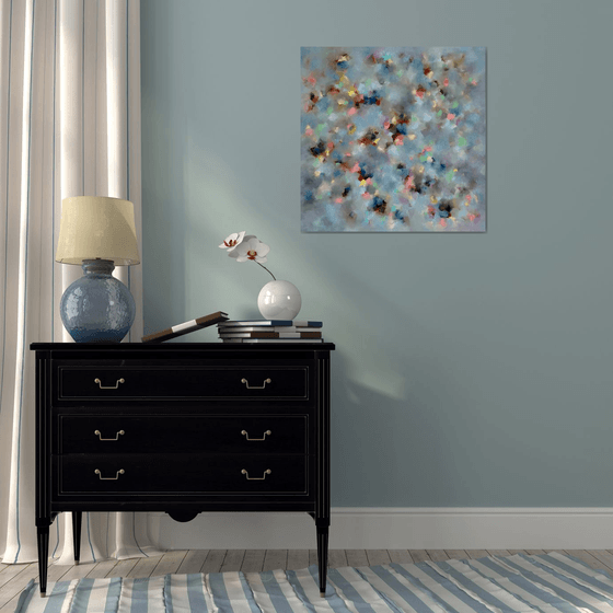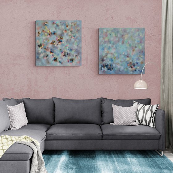 A mesmerising painting in light greenish-blue tones. Repetitive elements and rhythms are hypnotising, drawing the viewer to enjoy the interplay of lights and halftones, freeing the minds as if in meditation. Soft brushstrokes, blurred colour transitions are hypnotising, relaxing and energising. The painting can be seen as a separate artwork or as part of a cycle (diptych or triptych) of 'Sonata'. The other two parts of the cycle are “Dolce e piano” and “Allegro ma non troppo”.