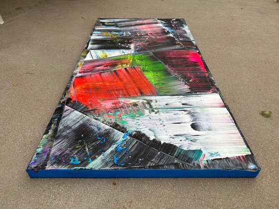 This is a unique modern large PMS abstract acrylic triptych painting that will make a statement in your home or office. These pieces have an energetic, wild, emotional and beautiful modern design aesthetic. The colors streak and overlap, while also being contrasted by bold and subtle color shifts. The accents of bright pink, red, blue, yellow, black and splashes of fluorescent green is both modern and striking. These pieces are dynamic and each individual painting adds a unique perspective to the series as a whole. It is truly an abstract modern triptych painting like no other that will enhance your space.