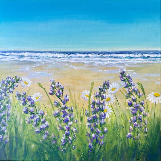 This 20" x 20"acrylic painting is a joyful escape to the shoreline, where the air is heavy with the scent of salt and summer blooms. In the foreground, wild lavender and cheerful white daisies sway in the breeze-painted with expressive, textured strokes that bring the flowers to life. Their purple and white petals pop against lush green grasses, grounding the piece with a burst of nature's spontaneity.