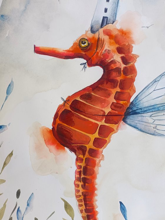 Watercolor on paper 38x56cm. Unframed. Sea horse with dragonfly wings. Surreal illustration.