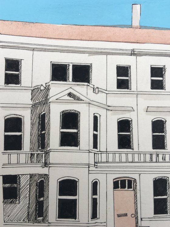 A pen and ink with gouache drawing of part of a Victorian terrace of seafront houses beneath a cloudless sky. It is executed on 120gsm cartridge paper and is drawn in a realistic, Retro, style, is signed at bottom right, is unmounted and unframed.