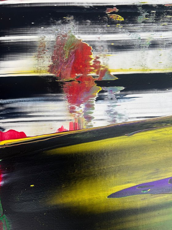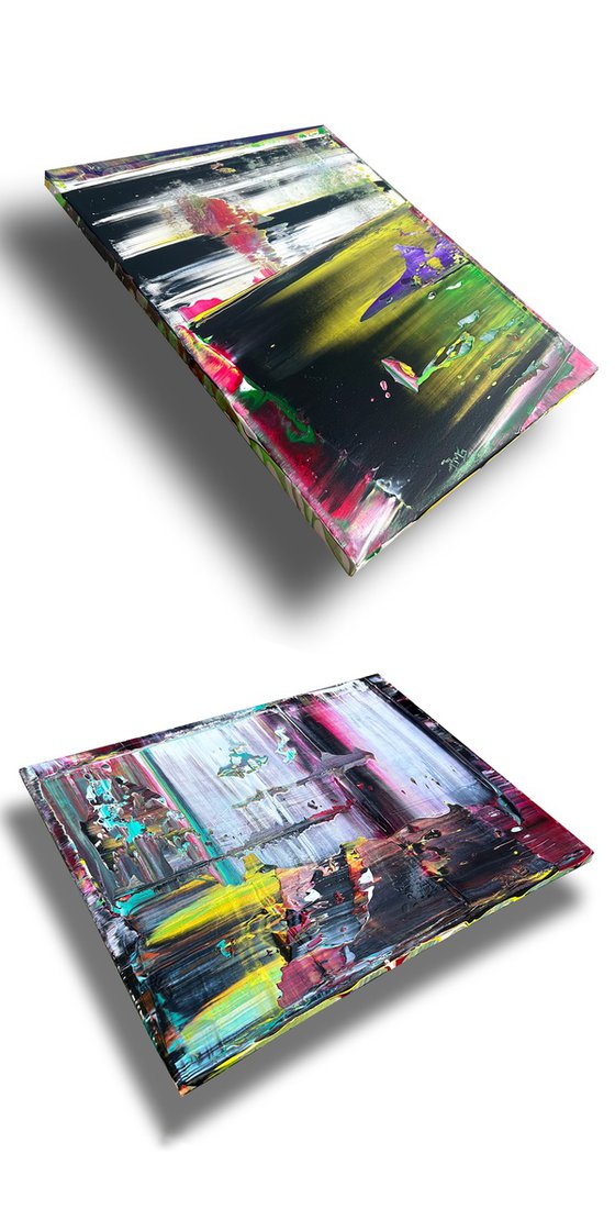 This is a unique modern PMS abstract acrylic diptych painting that will make a statement in your home or office. These paintings are dark, mysterious, dynamic and playfully energetic, in an abstract, Tim Burton kind of way. The colors streak and overlap, while also being contrasted by bold, vibrant color shifts. The paintings highlight fluorescent yellow, green, red, black and white, with hints of purple and turquoise in a balance of streaking colors and slices of texture. It has a playfully dark feeling, that embodies the energy and playful emotions of films like "Beetlejuice" and other whimsically macabre works. It is truly an abstract modern diptych series like no other that will enhance your space.
