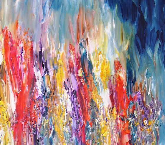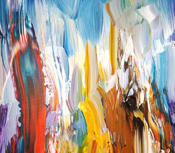 Awesome, very large artwork. Abstract painting, the center of which seems to be reflected on a indicated horizon line in the sunset. The contrasting center is created in orange, red, pink, yellow, white, purple and sienna colors against a background of blue and turquoise colors. A modern work that invites the inclined viewer to take a mental excursion beyond everyday life.